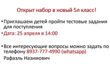 Открыт набор в новый 5л класс! 25.04.2024