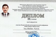 4в сыйныф укучысы Эль-Шейкх Асиль фәнни конферециядә катнашып, III дәрәҗәдәге дипломга лаек булды. Котлыйбыз!