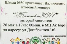 Приглашаем наших родителей, друзей на наш итоговый концерт "Балачак-2017" В этот вечер на сцене будут выступать все учащиеся нашей школы. Ждем вас 26 мая в МЦ "Ак Барс". Начало меропрития в 17.00