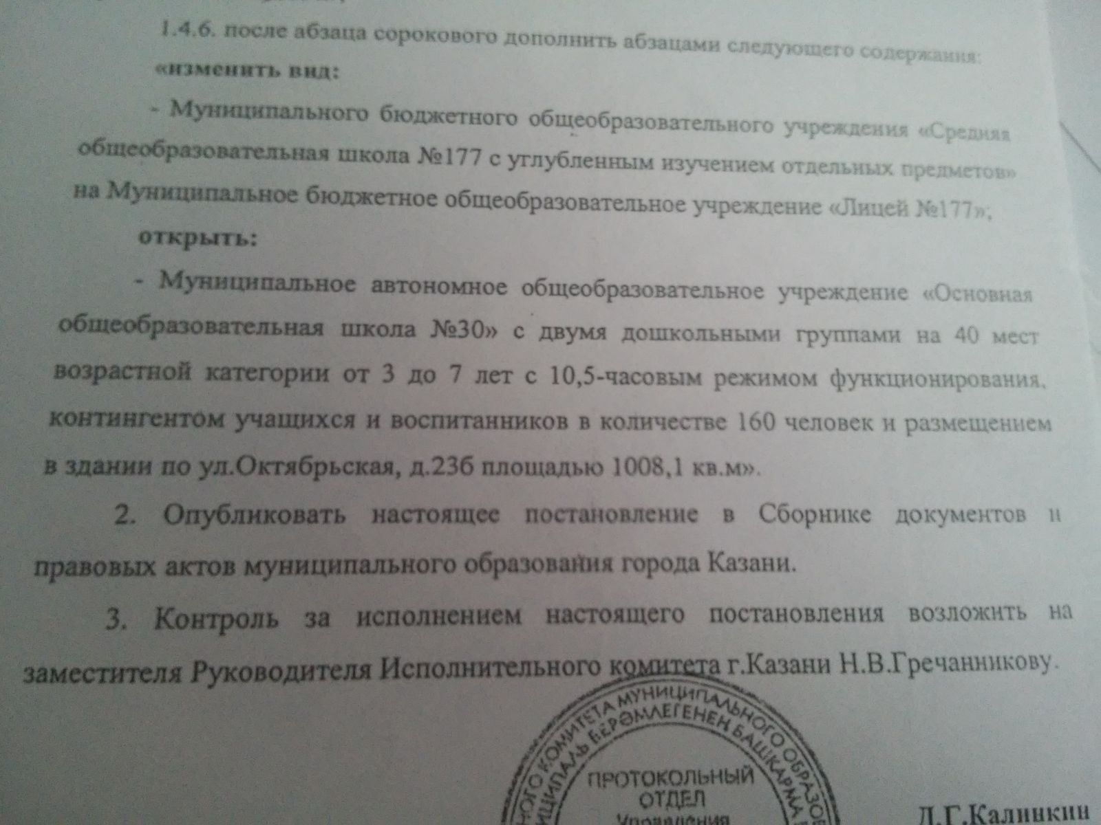 В 2015 году Постановлением № 3248 от 27.08.2015 Исполнительного комитета г.Казани окрыто Муниципальное автономное общеобразовательное учреждение "Основная общеобразовательная школа №30"