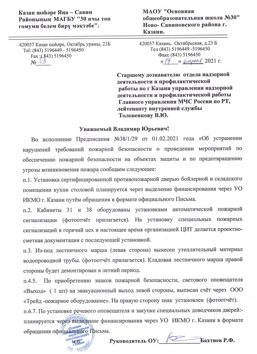 Ответ на предписание Департамента надзора и контроля в сфере образования РТ  № П 975/21-Д-ГН от 25 мая 2021 года "Об устранении нарушений в МАОУ "ООШ №30"