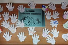 Сегодня в нашей школе прошла акция «Чистые ладошки». Сначала обучающиеся обсуждали проблему взяточничества, предлагали пути решения этой проблемы. А затем на стенах школьного коридора появилось целое море чистых ладошек. Ладошек, которые не запятнаны бесчестными поступками и обманом. Ладошек, на которых только добрые дела, которыми можно гордиться. Они вырезали из чистого листа бумаги силуэт своей руки .
