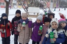Ученики 1А класса во дворе школы развесили кормушки, насыпали в них зерна,семечки.