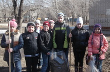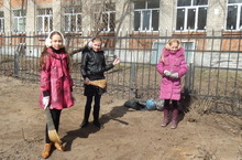 Учащиеся 4Б класса соревнуются за самый чистый участок. Девочки: "Вот какие мы молодцы!"