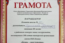 Поздравляем команду экскурсоводов Емелина Веру (10А), Галимову Айсылу, Иванова Илью(7Б) (науч.рук. Бурганова Т.Н.) с 3 местом на районном конкурсе экскурсоводов «Казань - город детства моего»
