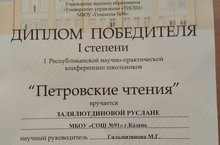 Поздравляем Залютдинову Руслану (науч.рук. Гильмизянова М.Г.) с дипломом первой степени в республиканской конференции "Петровские чтения"