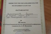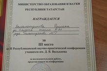 Залялютдинова Руслана(науч.рук. Гильмизянова М.Г.) заняла 3 место на республиканской НПК им.Д.В. Вилькеева