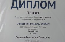 Ученица 4а класса Седова Анастасия.(науч.рук. Глебова И.А.) призер WinKid по русскому языку.