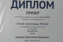 Ученица 4а класса Седова Анастасия призёр очной олимпиады Winkid (науч.рук. Глебова И.А.)