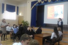 Участники антинаркотического проекта "Самостоятельные дети" из 8б класса на встрече с представителем республиканского центра по профилактике СПИДа. Встреча приурочена к Всемирному дню борьбы со СПИДом.