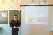 Классный час сопровождался презентацией по многовековой истории Крыма. История Крыма представлена была с заселения полуострова. Вначале на экране дана была панорама Крыма из космоса, затем слайды по киммерийцам, скифам, грекам, гуннам, хазарам и т.д. В ходе демонстрации сделан акцент по истории появления руссов, крещению киевского князя Владимира; отражена политика Екатерины II, строительство Севастополя и Симферополя; история Гражданской войны, Великой Отечественной войны; передача Крыма Украинской ССР; итоги общекрымского референдума 17 марта 2014г. На протяжении всего мероприятия шёл комментарий всех слайдов, приводились оценки сложившегося положения на территории Крыма ведущими политиками, давались разъяснения по ходу показа.В заключении, был подведён общий итог и дана оценка значимости вхождения Крыма в состав РФ. День 18 марта 2014 г. стал исторической датой – долгожданное воссоединение Крыма и России, это великое событие в новейшей истории не только нашей страны, но и мира и мы с вами являемся участниками и свидетелями, запомните, как это было, и став взрослыми будете рассказывать об этом своим детям и внукам.