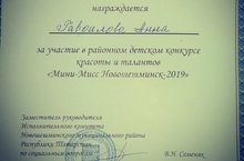 Гаврилове Анне, вручен диплом, за участие в районном детском конкурсе красоты и талантов "Мини мисс Новошешминск 2019". Поздравляем Анечку, и желаем ей дальнейших побед.