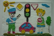 Дети не только учатся правилам дорожного движения, но еще создают красоту из пластилина. Марина Николаевна, и дети старшей группы сконструировали из пластилина картину "Мы учим дорожные знаки!".