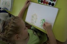 Выбираем бумагу для рисования и правильно располагаем лист на столе перед собой. Рисуем елочку по порядку: сначала ствол коричневого цвета, а потом по бокам ствола зеленые ветки – начинаем рисовать ветки сверху вниз, ветка справа – ветка слева, ветка справа – ветка слева. Иголки наносятся кончиком кисточки короткими штрихами.