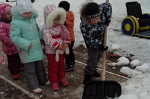 Дети очень любят гулять на улице зимой, при помогать сторожу согребать снег. Артем учит детей, как правильно держать лопату.