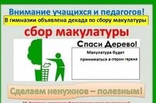 Ребята! В гимназии объявлен сбор макулатуры! Проблемы с экологией планеты в большой степени связаны с загрязнением природы различными продуктами жизнедеятельности человека. И с каждым годом подобная проблема набирает всё больше актуальности. Бумажные изделия - это треть всех твердых бытовых отходов, а переработка втор сырья приносит большую пользу для окружающей среды. Ежедневно из квартир, офисов или различных учреждений утилизируется большое количество использованной бумаги. При правильно подходе и организации подобную бумагу можно использовать не только один раз. Сбор макулатуры в школах – это не только возможность защитить экологию и сохранить в целости деревья, но и приобщения учеников к общественной деятельности. В первую очередь бумага должна быть сухой и без каких-либо признаков горения. Кроме того, для удобной транспортировки лучше всего слаживать бумагу в специальные коробки. -