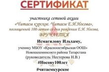 Ученик 5 класса Исмагилов Ильхам принял участие в сетевой акции "Читаем курское, читаем Е.И.Носова" Данная акция посвящена 100-летию со дня рождения Е.И.Носова, русского и советского писателя, родившегося в г. Курск. Направлена акция на формирование культуры чтения, формирование нравственности учащихся. Ильхам прочитал отрывок из рассказа "Живое пламя"