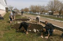 3 мая 2013г. мужчины нашей школы завезли камни для клумб. Учащиеся выложили клумбы, перекопали на них землю, подготовив почву для высадки рассады цветов. Посеяли семена бархатцы и вьюнки.