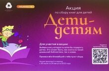 Министерство просвещения Российской Федерации информирует о том, что Общероссийской общественно-государственной детско- юношеской организацией «Российское движение школьников» совместно с региональными штабами общероссийского проекта взаимопомощи гражданам во время кризисных ситуаций #МЫВМЕСТЕ проводится всероссийская акция по сбору книг для детей Донецкой и Луганской народных республик «Дети – детям» (далее – акция), которая продлится до 20 августа 2022 года. В рамках акции предполагается передача в дар книг в хорошем состоянии (в том числе новых) любого жанра. По окончании акции все собранные книги будут переданы на территории Донецкой и Луганской народных республик.