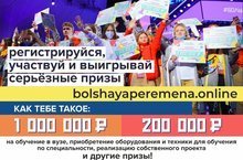Дорогие ребята «Большая перемена приглашает вас на конкурсы. Ты найдешь интересный для тебя вызов: «Создай будущее!», «Меняй мир вокруг!», «Твори!», «Делай добро!», «Помни!», «Сохраняй природу!», «Расскажи о главном!», «Будь здоров!», «Открывай новое!», «Предпринимай!», «Служу Отечеству!». Участвуй в конкурсе «Большая перемена» и получай бомбические призы.