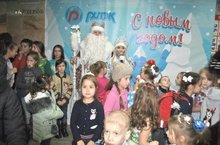 А на сцене уже появились сказочные герои Мышка, Кошка, Ученый и Клякса. Именно Клякса – самый отрицательный герой, стал любимчиком всей детворы, они не сводили с него глаз, реагировали на каждое его слов, повторяли его движения, помогали ему спрятаться. Сюжет сказки был закручен настолько увлекательно и (очень важно) познавательно, что, кажется, дети и забыли об отсутствии главных героев празднества – о Дедушке Морозе и Снегурочке. Но в назначенный час они пришли и расставили все по своим местам: Дед Мороз – показывает волшебство, Снегурочка загадывает загадки, остальные персонажи помогают детям их разгадывать. Закончилась сказка, как и полагается, победой добра над злом, веселья над грустью. А ее герои спустились к детям в фойе, где пытались создать большой хоровод, но не получилось – тесновато для такого количества детей. Но, не растерялись и провели много других игр и забав, танцевали, много фотографировались, раздавали кульки от компании РИТЭК.