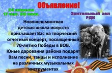 16 апреля в ДШИ прошел отчетный концерт, посвященный 70 - летию победы в Великой Отечественной войне. На концерте показали свои таланты учащиеся класса баяна, гитары, фортепиано, духовые инструменты, вокальное отделение. В заключении концерта, учащиеся были награждены дипломами и грамотами за достижения и активную деятельность в школе. Пожелаем им успеха и чтобы через всю жизнь они сумели пронести чувство глубокой благодарности к своим наставникам и родителям -главным составляющим любого детского успеха!