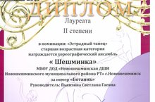 Хореографический ансамбль «Шешминка» принял участие в Открытом конкурсе-фестивале хореографических коллективов детских музыкальных школ и школ искусств «Золотой башмачок»в г. Казани. Младшая группа ансамбля в номинации «Детский танец» получила Диплом III степени, старшая группа в номинации «Эстрадный танец» стала Лауреатом II степени. Мы поздравляем с очередной победой участников ансамбля, постановщика и педагога Ерохину Валентину Вячеславовну, а также руководителя ансамбля Пьянзину Светлану Гаевну.