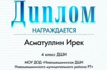 3 ноября проходил международный и всероссийский дистанционный конкурс "Таланты России", ученик 4 класса по специальности баяна Асматуллин Ирек, награжден дипломами за Международный конкурс I место, и Всероссийский конкурс II место