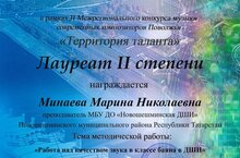 Преподаватель музыкального отделения по классу баяна Минаева М.Н. приняла участие в Межрегиональном конкурсе методических работ "Музыка в широком понимании:иизучение и исполнительство в рамках II Межрегионального конкурса музыки современных композиторов Поволжья "Территория таланта". Её работа по теме "Работа над качеством звука в класса баяна в ДШИ" получила Диплом Лауреата II степени. Поздравляем Марину Николаевну с творческим успехом!