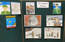 В фойе второго этажа школы оформлена выставка рисунков учащихся художественного отделения "На защите Родины". В выставке приняли участие Логинова Виктория "На жизнь с надеждой", Салахова Назифа "Тяжелое время надежды", Лазарева Арина "Чтобы вечно помнили", Гафурова Эвелина " По дорогам Ленинграда", посвященная 80 - летию снятия Блокады Ленинграда. Педагоги Старикова О.В. и Рамазанова Г.М.