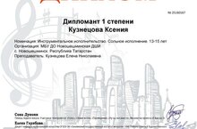 Учащаяся музыкального отделения по специальности фортепиано Кузнецова Ксения приняла участие в Международном многожанровым конкурсе "Город звезд" и стала Дипломантом I степени в номинации инструментальное исполнительство, сольное исполнение. Поздравляем Ксению и ее педагога Кузнецову Е.Н. с успешным выступлением и желаем творческих успехов!