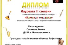 Учащаяся музыкального отделения по специальности фортепиано Салихова Амина приняла участие в VI Республиканском фестивале - конкурсе "Камская мозаика" в г. Чистополь и стала Лауреатом III степени в номинации "Музыкально - теоретическая олимпиада" Поздравляем Амину и ее педагога Маланчеву Венеру Рафкатовну с победой! Педагог Маланчева В.Р. награждена Благодарственным письмом фестиваля. Желаем ученице и педагогу творческих успехов и больших достижений на стези теории!
