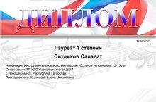 Учащийся музыкального отделения класса фортепиано Ситдиков Салават принял участие во Всероссийском многожанровом патриотическом конкурсе "Наша страна" и стал Лауреатом I степени в номинации "Инструментальное исполнительство. Сольное исполнение 13-15 лет". Поздравляем Салавата и его педагога Кузнецову Елену Николаевну с успешным выступлением на конкурсе! Молодцы!