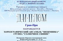 Хореографический ансамбль "Шешминка" группа "Солнечное сияние" принял участие в III Международном онлайн конкурсе "Чудеса зимней сказки" г.Волгоград и получил Диплом Гран - При за номер "Ой да не вечер" в номинации народно - стилизованный танец, ввозрастной категории 13 - 15 лет. Поздравляем ребят и их педагогов Пьянзину С.Г., Ерохину В.В. и Никитину К.В. с достойной победой и желаем дальнейших творческих успехов.