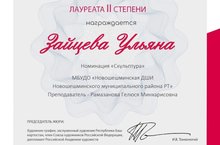 Ученицы художественного отделения Зайцева Ульяна и Салахова Назифа приняла участие в III Всероссийском конкурсе изобразительного искусства "ART Terra". В номинации "скульптура" Зайцева Ульяна стала Лауреатом II степени педагог Рамазанова Г.М., Салихова Назифа получила Диплом педагог старикова О.В.. Поздравляем Ульяну и Назифу, а также их педагогов с отличными результатами и желаем дальнейших успехов!