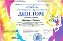 Учащиеся класса вокала приняли участие в VII Республиканском фестивале-конкурсе "Прорыв" в рамках проекта "В ритме Жизни". В номинации "Эстрадный вокал на русском языке. Соло" II младшая группа (9-10 лет) Бочкарев Даниил Лауреат II степени, Мусин Мансур Лауреат III степени, Хорьков Даниил Дипломант I степени. Адиева Алина в номинации "Патриотическая песня. Соло" I средняя групппа (11-12 лет) Лауреат II степени. Поздравляем ребят и их педагога Мазманян Любовь Николаевну с отличными результатами и желаем новых творческих побед!