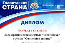 Хореографический ансамбль "Шешминка" средняя группа "Солнечное сияние" принял участие во Всероссийском конкурсе-фестивале "Талантливая страна"в формате Онлайн с танцем "Ой да не вечер" и получил Диплом Лауреата I степени. Педагоги ансамбля Пьянзина С.Г., Ерохина В.В., Никитина К.В. и директор школы Слимова И.М. получили Благодарственные письма от оргкомитета Фестиваля.