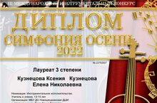 Ученица музыкального отделения по специальности фортепиано Кузнецова Ксения педагог Кузнецова Е.Н. приняла участие в Международном инструментальном конкурсе "Симфония осени 2022" и получила Диплом Лауреата III степени. Поздравляем Ксению и ее педагога с победой. Желаем творческих успехов!