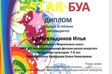 Ученик класса фортепиано класс Кузнецовой Е.Н. принял участие во II Республиканском конкурсе детского и юношеского творчества "STAR - БУА" в номинации "фортепиано соло" в возрастной категории 7 - 9 лет г.Буинск и получил Диплом Лауреата II степени. Поздравляем Илью и его педагога Кузнецову Е.Н. с высоким достижением и желаем дальнейших побед!.
