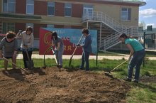 Перекопали землю, подрезали спиреи, посадили газонную траву.