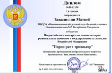 «Победа во всероссийском конкурсе» 25.01.2017 Дипломом I степени всероссийского конкурса «Гордо реет триколор» в номинации: произведения изобразительного искусства «Мы сила!» награжден Завалишин Матвей наш воспитанник старшей группы. Поздравляем!!!