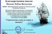 Победа в конкурсе"Героическая слава на морях и океанах" 28.12.2016 Педагоги нашего детского сада в очередной раз стали участниками, и призерами 2 Всероссийского конкурса, посвященного истории ВМФ "Героическая слава на морях и океанах". На конкурс совместные работы воспитателей и их воспитанников были направлены Завалишиной О.Н., Шолгиной И.А., Бикбовой Ф.Ф., Михайловой Л.Н. Все были награждены Дипломами 2 степени.