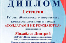 По итогам Республиканского конкурса "Солдатами не рождаются" в номинации рисунок победителями стали Михайлов Дмитрий (Новошешминская гимназия) и Данилова Элина (Черемуховская СОШ). Михайлов Дмитрий награжден дипломом 1 степени, Данилова Элина дипломом 3 степени. Педагоги награждены благодарственными письмами.