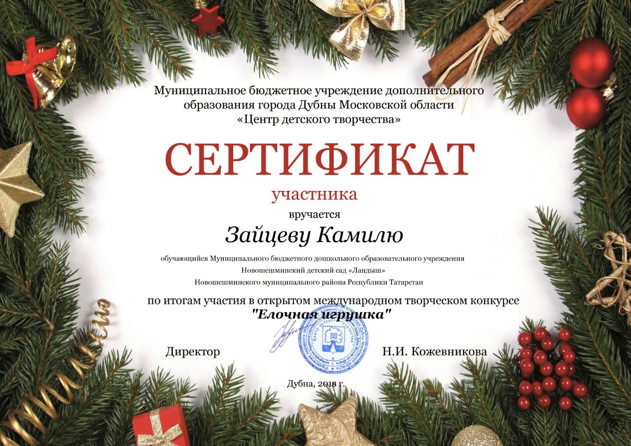 1. Зайцев Камиль Открытый международный творческий конкурс "Елочная игрушка"