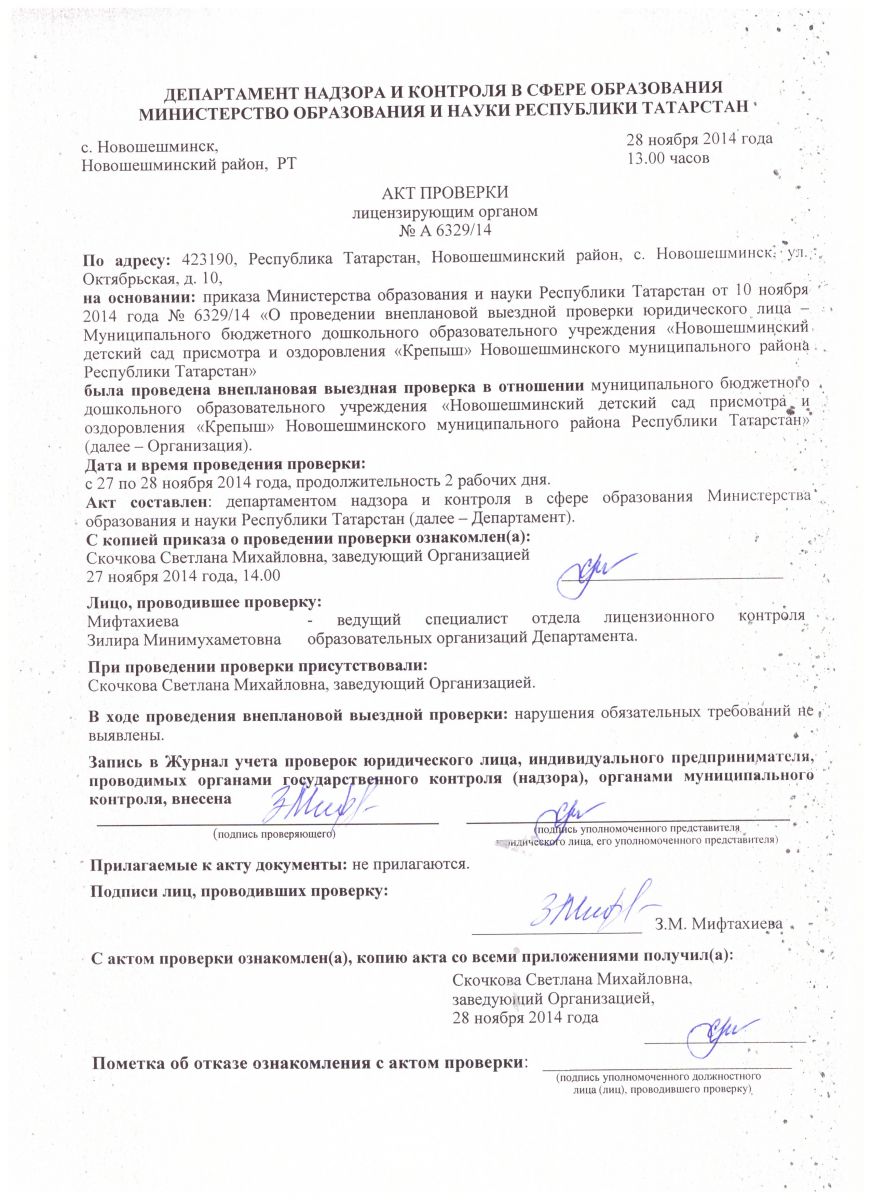 Акт проверки департаментом надзора и контроля в сфере образования МОиН РТ