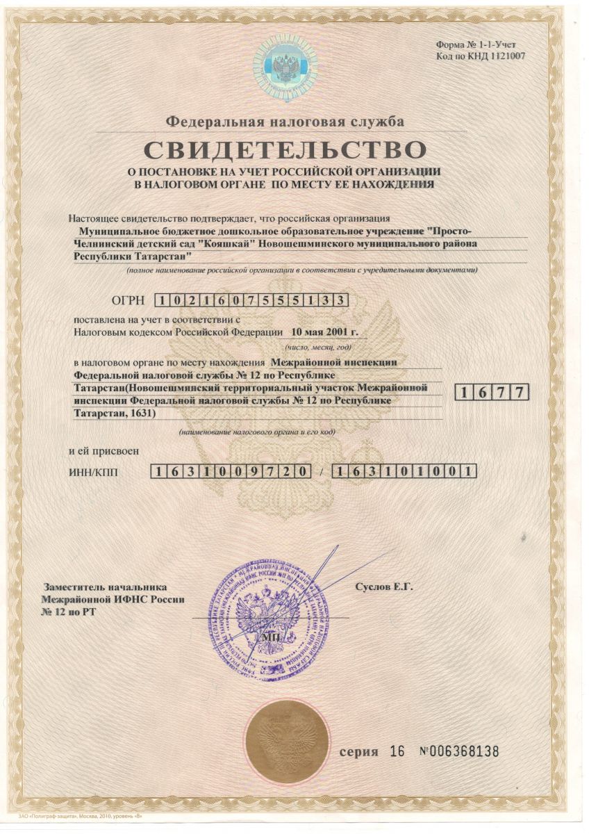 Сидетельство о постановке в налоговом органе.