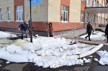 Сегодня в нашей школе прошёл субботник, работники школы раскидывали снег вокруг здания.