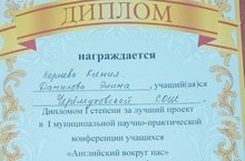 Поздравляем Корневу К. и Данилову Э. с 1 местом в научно-практической конференции учащихся "Английский вокруг нас". Поздравляем девочек и их руководителя Корневу Светлану Владимировну. Желаем дальнейших побед!