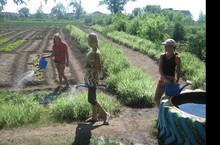 Учащиеся школы ходят на практику. Работают на пришкольном участке. Полят и поливают грядки.