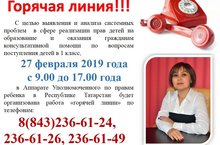 В соответствии с планом работы, с целью выявления и анализа системных проблем в сфере реализации прав детей на образование и оказания гражданам консультативной помощи по вопросам поступления детей в 1 класс, 27 февраля 2019 года с 9.00 до 17.00 года в Аппарате Уполномоченного по правам ребенка в Республике Татарстан будет организована работа «горячей линии» по телефонам 8(843) 236-61-24, 236-61-26, 236-61-49.